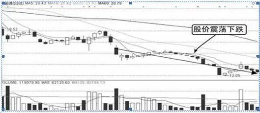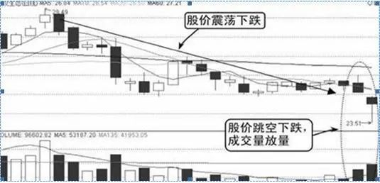 由图中可知,该股在经过跳空下跌后股价继续下滑,成交量间断放大,股价收出多根小阴星和小阴线。若投资者遇此情况应及时在股价跌势放缓时出局。