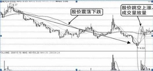 由图中可知,股价从高位震荡下跌,成交量此时并未放大,而是保持地量水平,说明股价下跌没有多少接盘,市场普遍不看多。股价两次成功探底后开始展开拉升的行情,到达一定高度后出现跳空上涨,成交量放大,如下图所示。
