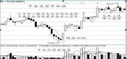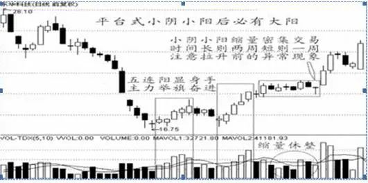 图解小结:经过调整后,经缩量小阴小阳搭配平台,突然一天放量大阳拉起摭盖前三天以上的K线。