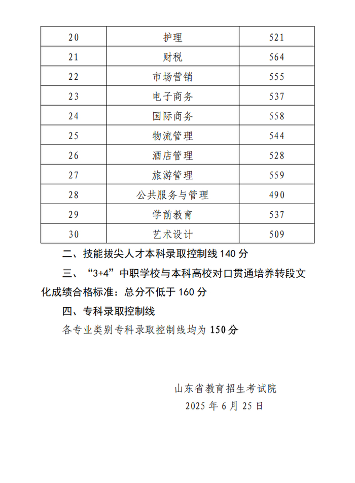 青岛日报社/观海新闻6月25日讯 今天下午,山东省教育招生考试院发布了春季高考各专业类别录取控制线。春季高考分为现代农艺等30个专业类别,分专业类别划定本专科录取控制线,各专业类别的本科录取控制线统一在省招考院官方网站发布。各专业类别的专科录取控制线均为150分。技能拔尖人才本科录取控制线为140分。“3+4”中职学校与本科高校对口贯通培养转段文化成绩合格线为160分。