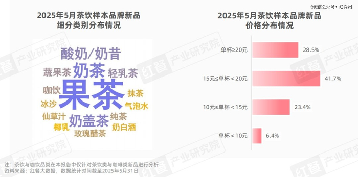 从价格分布来看,5月茶饮品牌的新品价格主要集中在15元≤单杯<20元和单杯≥20元两个区间内,占比分别为41.7%和28.5%,而10元以下和10元≤单杯<15元的茶饮新品则相对较少,占比分别为6.4%和23.4%。