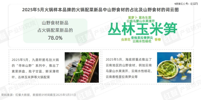 其中,火锅配菜类的新品数量最多,共计25款,占新品总数的36.2%。其中,山野食材的占比为78%,表明山野食材成为火锅品牌研发新品的核心方向,反映出品牌对健康化、特色化菜品的重视。从具体的词云图来看,山野食材种类较为多样,涵盖了孢子甘蓝、薄荷叶、紫色生菜、虫草花、水性杨花、香椿等山野食材。此外,云南山野食材是5月火锅品牌挖掘的重点,品牌借助云南特色食材的稀缺性与独特性,为消费者带来“天然山野+地域风味”的沉浸式火锅体验。