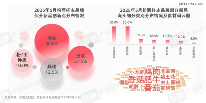 从汤粉/面、拌粉/面类新品创新点的分布情况来看,在5月,粉面品牌主要将产品创新的重心聚焦于浇头上,占比高达80%,远高于汤底、粉/面种类等类别的创新。