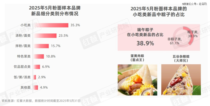 值得一提的是,在小吃类新品中,粽子类新品的占比为38.9%,这表明粉面品牌在借势端午节这一传统节日,挖掘节日特色小吃的市场潜力。