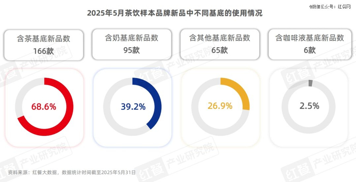从茶饮类和咖啡类新品使用的基底来看,含茶基底的新品数达166款,占比为68.6%;其次,含奶基底的新品和含其他基底的新品也较多,分别有95款和65款,占比分别为39.2%、26.9%;而含咖啡液基底的新品最少,占比仅有2.5%。值得关注的是,相较于2025年4月,气泡水、果汁、盐水等具有清爽感的基底开始被大量运用到新品中。