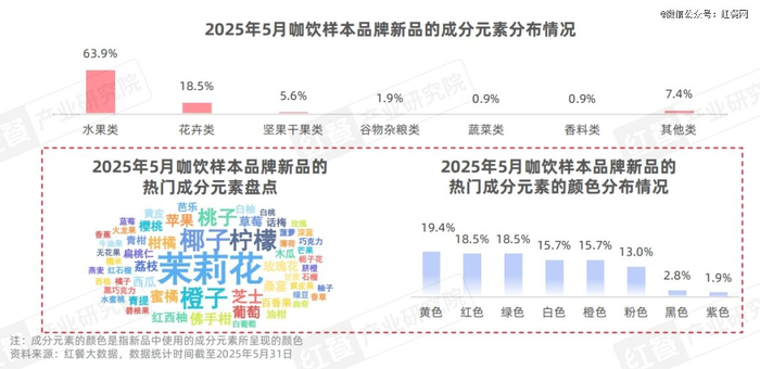 从具体的词云图来看,水果类元素的使用主要聚焦于椰子、橙子、柠檬、桃子等,咖饮品牌通过酸甜清爽的果香基调平衡咖啡的苦涩感。例如,库迪咖啡推出了桃子冰茶美式、桃桃白柚冰茶等新品;幸运咖推出了真橙鲜萃咖、椰椰拿铁等新品。