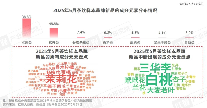 从茶饮类与咖啡类新品的成分元素来看,为契合消费者对“天然、清爽、健康”的需求,茶饮品牌运用了大量的水果类元素,其次是花卉类、谷物杂粮类。具体来看,水果类成分元素中,除了草莓、芒果等经典水果和杨梅、水蜜桃等时令水果外,三华李、酸木瓜、野酸角、黄皮等极 具南方地域特色的小众水果也被挖掘了出来。例如,茶百道推出了木姜子醒橄榄、木姜子香芒果等新品;苏阁鲜果茶推出了云南夏甜·杨梅蜜桃、云南夏甜·杨梅冰等新品。