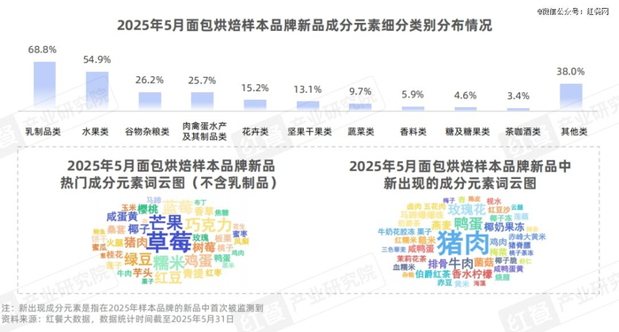从新品的成分元素细分类别情况来看,乳制品类作为面包、蛋糕、糕点的基础原料,在新品中的占比最多;水果类作为面包烘焙产品的经典搭配,占比亦超过五成。
