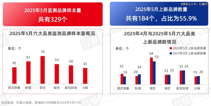 为洞悉餐饮行业产品上新发展趋势,红餐产业研究院选取了餐饮行业具有代表性的六个品类作为监测对象,包括西式快餐、粉面、茶饮、咖饮、面包烘焙、火锅这六大品类。在2025年5月,红餐产业研究院监测的六大品类的品牌样本量一共有329个,总计有184个品牌推出新品,占监测品牌样本量的55.9%。