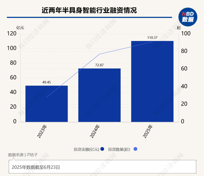 《每日经济新闻》记者通过IT桔子创投数据服务平台梳理发现,截至6月23日,年内我国具身智能行业的投资事件共计91起,已经超过2024年全年的77起,总投资金额达到110.37亿元。