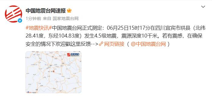 宜宾市珙县发生4.5级地震 四川日报网 2025.06.2515:23 关注 转自:中国地震台网速报中国地震台网正式测定:06月25日15时17分在四川宜宾市珙县(北纬28.41度,东经104.83度)发生4.5级地震,震源深度10千米。