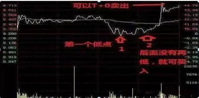 1、如下图,开盘后在低位震荡,但低点在一路抬高,那么在接近翻红的时候,买点2可以买入股票,后面如直线拉升的话,只要2-3个点以上,就要择机卖出了。假如买点2错过了机会,不要追,等直线拉升6个点左右,不能再往上冲的话,考虑把手中股票卖掉一点,等它下跌调整时再买进。