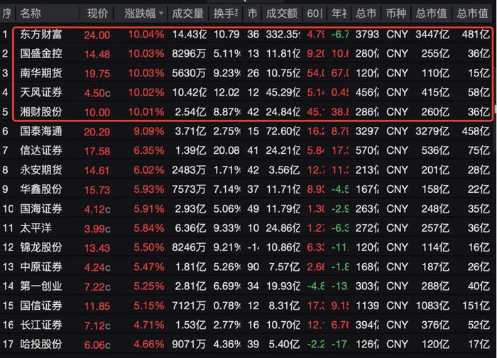 券商股持续爆发,A股上市券商无一下跌,东方财富、国盛金控、天风证券、湘财证券等多股涨停,近460亿元市值的国泰海通大涨9.09%。此外,信达证券、国海证券、太平洋、中原证券、第一创业等涨幅超5%。