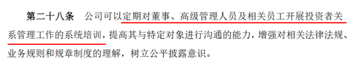 (5)定期对董高及相关员工进行投关培训:根据《上市公司投资者关系管理工作指引》第二十七条规定:上市公司可以定期对董事、高级管理人员和工作人员开展投资者关系管理工作的系统性培训。