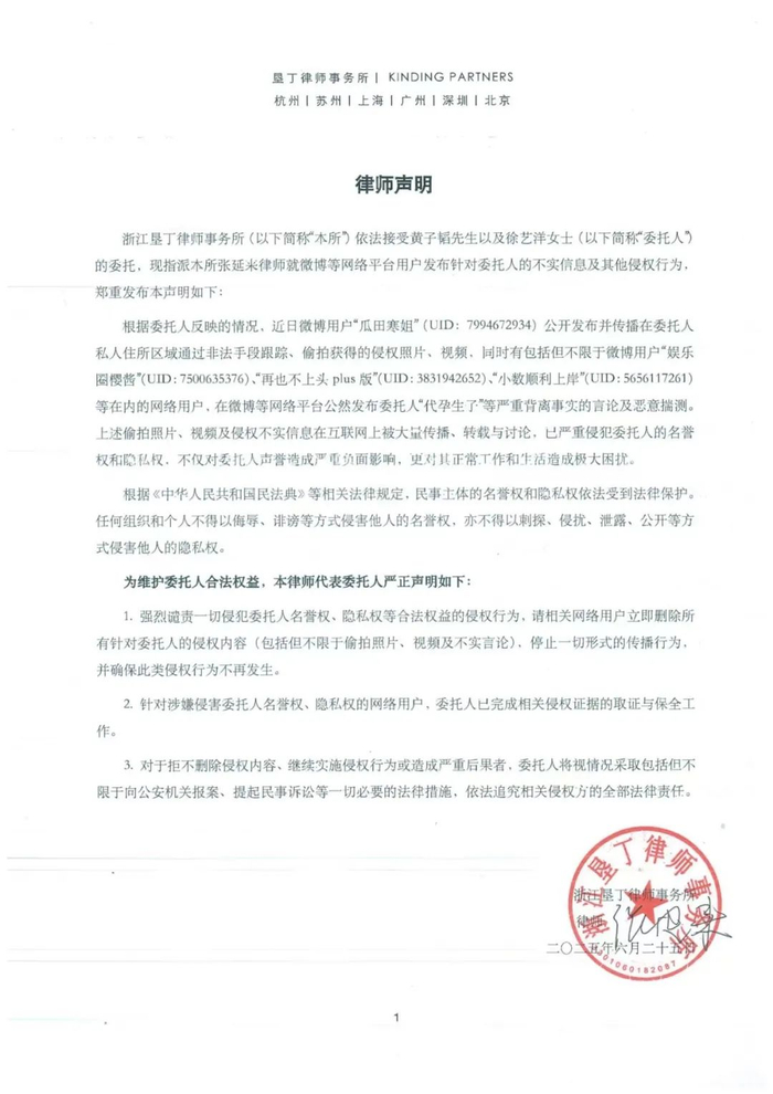 6月25日,@黄子韬ZTAO工作室 发布严正声明:所谓“黄子韬徐艺洋夫妇涉及代孕”的传闻,纯属恶意捏造的虚假信息,完全背离事实。两位艺人从未实施、参与任何形式的代孕行为,相关谣言系对艺人私生活的严重诽谤与无端干涉。