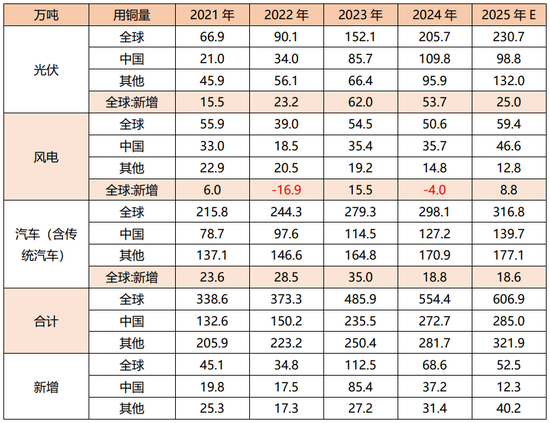 新能源贡献主要增量:光伏、风电、汽车用铜新增52.5万吨。