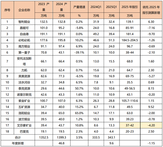 根据各家公司2025年产量最新指引,全年新增铜精矿产量较一季度末预估有所下调。其中新增贡献主要集中在智利铜业、五矿资源;产量下滑的企业包括必和必拓、英美资源、自由港、艾芬豪矿业等企业。