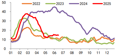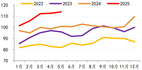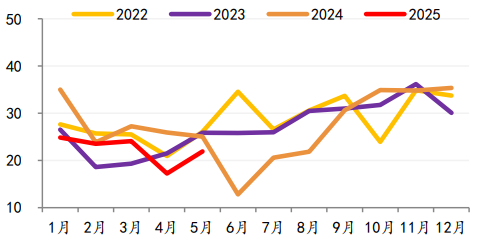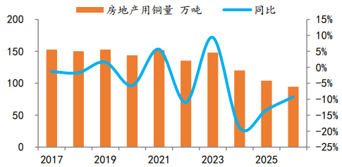 统计局最新公布的地产数据显示,2024年中国房屋竣工面积7.37亿平方米,同比-28%。2025年1-5月中国房屋竣工面积1.84亿平方米,累计同比-17.35%。由于竣工落后新开工约30个月,2025年竣工难有起色,预估竣工同比下滑20%,用铜量下降16万吨。