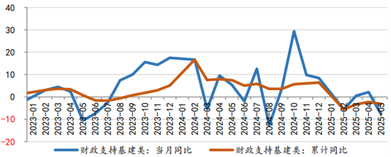 2025年全国一般公共预算支出297005亿元(含中央预备费500亿元),增长4.4%。赤字56600亿元,比2024年增加16000亿元。其中1-5月,全国一般公共预算基建类支出22073亿元,累计增速-3.15%(前值-2.25%)。各分项中,节能环保累计增速+6%(前值+6.2%),城乡社区事务支出累计增速-3.1%(前值-2.1%),农林水事务累计增速-7%(前值-5.9%),交通运输支出累计增速-0.1%(前值+0.4%)。4月关税冲突升级后,民生就业支出明显上升,基建类支出下滑有所加速。