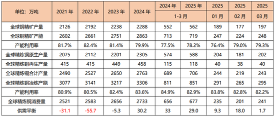 表 3.2:全球铜供需平衡表2024/2025(单位:万吨)