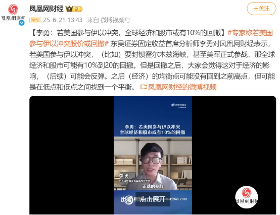 就在股民们操碎了心的时候,6月19日,东吴证券固定收益首席分析师李勇在直播中对凤凰网财经称,若美国参与伊以冲突,(比如)要封锁霍尔木兹海峡,甚至美军正式参战,那全球经济和股市可能有10%到20的回撤。