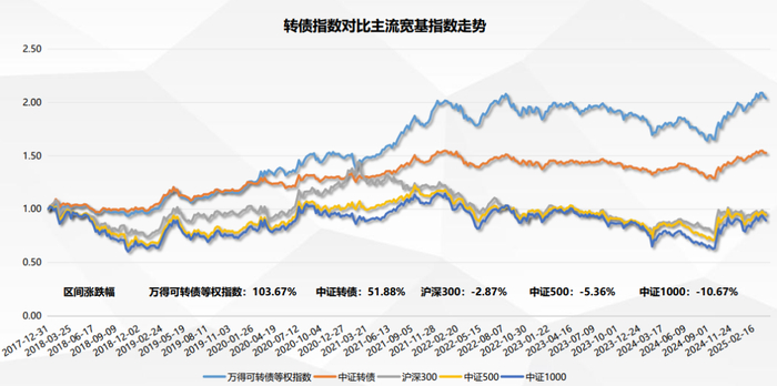 口说无凭,我们看一下可转债历年的表现。中证转债指数和各股票宽基指数的年度对比表明,2017年至今表现最好的就是中证转债指数。综合来看,2017年到2025年一季度,转债涨幅51%,同期沪深300跌幅-2.87%,中证500跌幅达5.36%,中证1000跌幅达10.67%。
