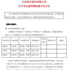 6月25日金融一线消息,兴业银行公告称,公司拟于2025年7月1日全部赎回1.3亿股“兴业优1”、1.3亿股“兴业优2”及3亿股“兴业优3”三期优先股。为保证公平信息披露,维护投资者利益,公司拟申请于2025年6月30日对三期优先股停牌,并于2025年7月1日对全部三期优先股赎回注销。