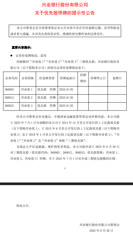兴业银行:拟于7月1日对全部三期优先股赎回注销 6月30日停牌