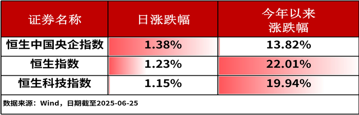 6月25日,港股主流指数集体收涨。其中,恒生中国央企指数上涨1.38%,涨幅相对居前。