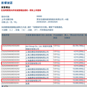 港交所近日公告显示,蚂蚁科技集团股份有限公司(下称“蚂蚁集团”)减持众安在线逾3300万股,按照成交均价19.38港元/股来计算,蚂蚁集团此次成功套现约6.54亿港元。此次套现后,蚂蚁集团持有的众安在线H股比例已经从10.01%降至7.63%。算上后者的5000万股内资股,蚂蚁集团减持后从众安在线第一季度末的第一大股东降至第四大股东,总持股比例从10.37%减至7.37%左右,而中国平安集团则以约10.21%的持股比例成为众安在线的第一大股东。