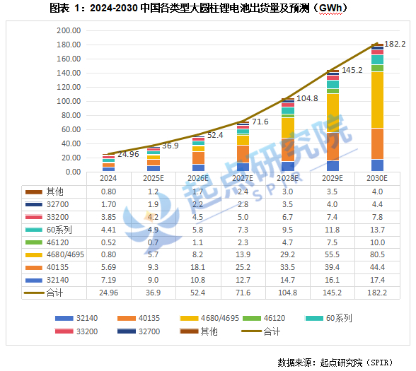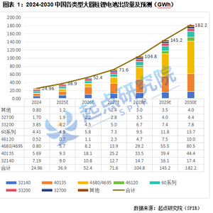 起点研究院(SPIR)统计,2024年中国大圆柱锂电池(直径30mm以上)出货量24.96GWh,其中主要出货类型为32140、40135、60系列、33200、32700等,占比分别为28.8%、22.8%、17.7%、15.4%、6.8%。预计到2030年4680/4695在新能源汽车领域的逐步应用,4680/4695将有望成为大圆柱电池主要型号,占比将达44.2%。