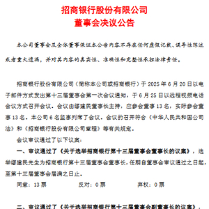 6月25日金融一线消息,招商银行今日发布董事会决议公告。公告显示,会议审议通过了《关于选举招商银行第十三届董事会董事长的议案》,选举缪建民为招商银行第十三届董事会董事长,任期自董事会审议通过之日起,至第十三届董事会届满之日止。
