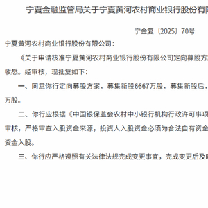 6月25日金融一线消息,宁夏金融监管局发布《关于宁夏黄河农村商业银行股份有限公司定向募股方案的批复》,核准该行定向募股方案,募集新股6667万股,募集新股后,股份总数由173333万股增加到180000万股。