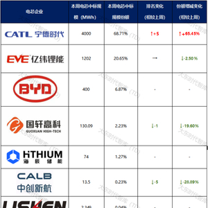本周宁德时代中标规模达4000MWh,占据68.71%的市场份额,排名第一,其主要受益于绿为(盐池县)储能技术有限公司1GW/2GWh储能项目以及通辽市奈曼旗2025年新型储能专项行动50万千瓦/200万千瓦时电网侧储能项目一工程总承包(EPC)项目。此外,亿纬锂能中标1202MWh,排名第二;比亚迪中标400MWh,排名第三。
