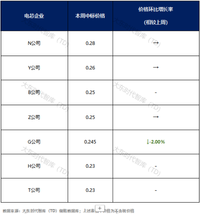 据广东省电池行业协会产业研究中心调研结果显示,本周开标储能项目中配套的电芯价格区间为0.23元/Wh-0.28元/Wh,最低报价环比上升4.55%,最高报价环比持平。电芯企业中标算数均价为0.249元/Wh,环比上周上升0.58%,加权均价为0.272元/Wh,环比上周上升9.58%。