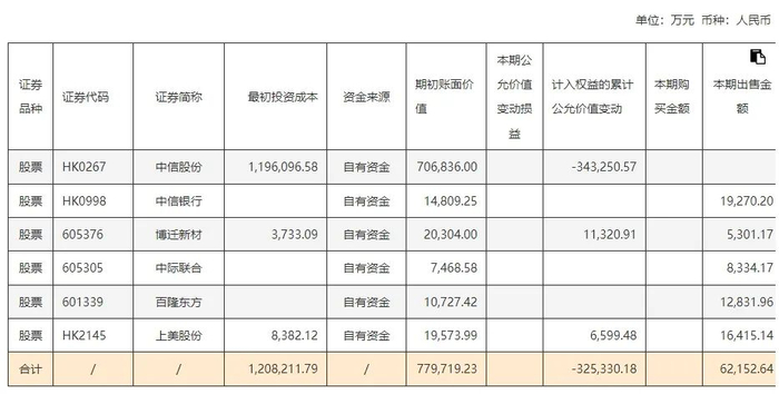 不过,雅戈尔的投资也并非无往不利,公司曾在入股中信股份的次年(2016年),因股价波动造成亏损。当时年报显示,雅戈尔投资中信股份亏损37.74亿元。2024年年报显示,中信股份、中信银行、博迁新材等6家证券投资,计入权益的累计公允价值变动为-32.53亿元。