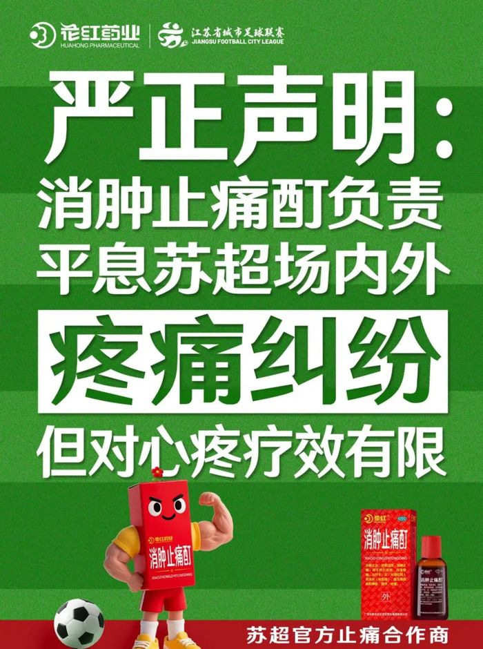 反观另一家赞助商——花红药业旗下消肿止痛酊,其借势苏超的打广告方式让人耳目一新。先是一则“严正声明”:我们的药品只负责平息比赛跌打损伤,对输球带来的心疼疗效有限!