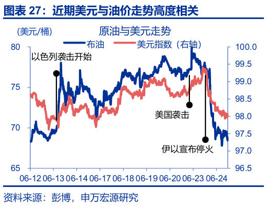 三、油价异动的次生影响:通胀压力下美债走弱美元偏强,对金价影响或相对有限。1)油价中枢变动10美元/桶对于全年CPI通胀的影响约0.2个百分点。下半年,在关税通胀效应逐步显现的阶段,如果油价上涨再“推波助澜”,美联储的紧缩压力或明显上升。2)美债利率趋于上行,美元、澳元等能源自给率较高国家的汇率或相对受益。3)供给冲击下的油价上涨,对黄金的影响并不明确。