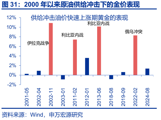 第三,供给冲击下的油价上涨,对黄金的影响并不明确。供给冲击下的油价上涨,既会推高通胀预期,又会导致名义利率上行,对金价影响无明确方向性。2000年以来的11次原油供给冲击,金价4次大涨的主要驱动力实为战争引发的避险需求;而当下,黄金的多头已相对拥挤。