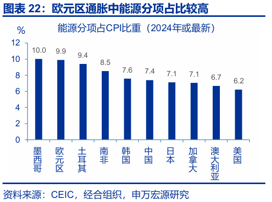 第一,如果油价上涨或显著推升通胀,美欧央行或面临紧缩压力。从1970年代两次石油危机到2022年俄乌冲突,世界对于油价上升所引发的通胀压力并不陌生。截止2024年,美国、欧元区能源分项在CPI中的比重分别为6.2%、9.9%,可见油价上涨对于欧元区通胀的影响更大。对美国而言,油价全年中枢每变动10美元/桶对于美国全年CPI通胀的影响为0.2个百分点1。考虑到前期关税征收滞后、企业“抢进口”此类“暂时性”因素阻碍了关税对通胀的传导;下半年在关税通胀效应逐步显现的阶段2,如果油价上涨再“推波助澜”,美联储的紧缩压力或明显上升。