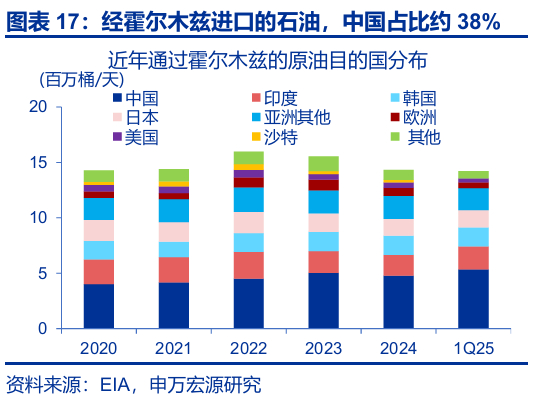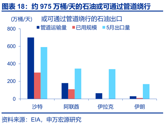 “封锁威胁”如果被兑现,油气供给或将面临巨大冲击。截至2025年一季度,占全球石油消费20%的石油均经过霍尔木兹海峡运出。分出口国来看,海峡封锁对沙特、伊拉克、阿联酋、伊朗、科威特每日出口冲击分别为530万桶、320万桶、180万桶、150万桶和140万桶。分目的地来看,中国、印度、韩国、日本和欧洲的原油进口受冲击较大,其中经霍尔木兹对外输出的原油中,中国占比高达37.7%。封锁发生后,部分原油或可通过管道“绕行”;这类管道合计有约555万桶/天的未使用产能,但即便顺利使用,也仍有约856万桶/天的供给缺口。