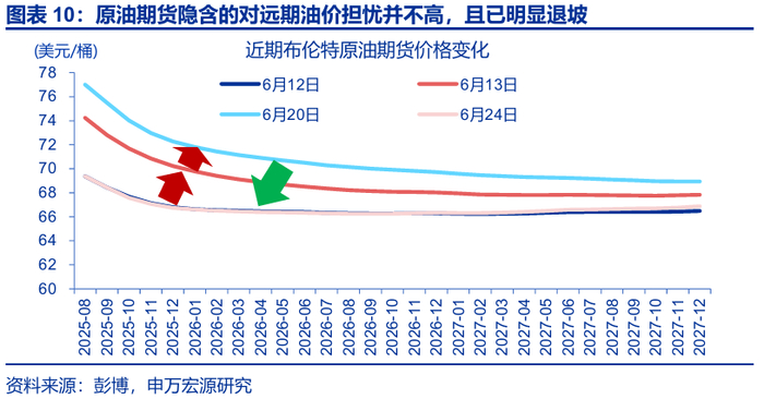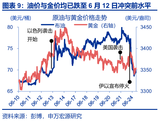 6月24日伊以宣布停火后,市场对封锁海峡的担忧已明显退坡,油价隐含的风险溢价已所剩无几。1)Polymarket隐含的伊朗2025年7月前、2025年年内封锁霍尔木兹海峡的可能性一度在6月23日触及33%和53%,但现已回落至5%和17%。2)在6月24日伊以宣布停火后,油价、金价共振下跌,均已跌至6月12日伊以冲突爆发前水平。3)期货价格始终呈现Backwardation结构,说明市场对海峡封锁的预期并不高,且当前近月期货价格也已回落至6月12日水平。4)期权市场,3个月布油平价期权隐含波动率一度高达44.3%,但现已回落至32.5%、低于6月12日。