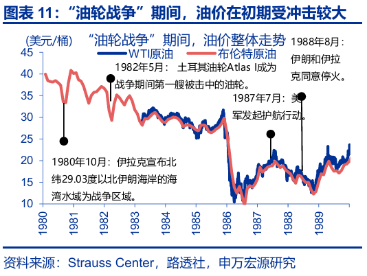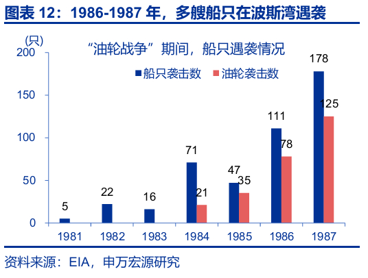 历史回溯来看,伊朗的“封锁威胁”未曾兑现,对油价多为短期冲击。近50年间,霍尔木兹海峡未出现过直接封锁。1)1980年“油轮战争”期间,伊拉克宣布海峡北部为战争区域,油价在随后2个月间大涨22.3%;1982年5月,首艘油轮被击中,油价短期跳涨6.2%。但“油轮战争”并没有严重扰乱石油运输1,随着1987年7月美国发起护航行动,油价企稳回落。2)2003年伊核问题发酵以来,伊朗多次威胁“封锁”海峡或进行“船只扣押”,油价在当日、后5个交易日、后10个交易日平均上涨1.9%、3.0%、3.4%,但这类冲击持续性不强,20个交易日内多有回落。
