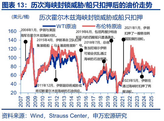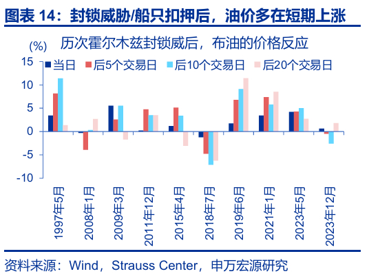 历史回溯来看,伊朗的“封锁威胁”未曾兑现,对油价多为短期冲击。2003年以来,伊朗多次威胁“封锁”海峡或进行“船只扣押”,油价在当日、后5个交易日、后10个交易日平均上涨1.9%、3.0%、3.4%;但这类冲击通常持续性不强,20个交易日内油价多有回落。