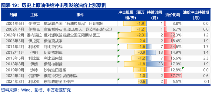 从2000年以来的11次原油供给冲击来看,每100万桶/天的供给冲击对油价冲击约10个百分点;如果海峡完全封锁,油价可升至130美元/桶。历史复盘来看,2000年以来的原油供给冲击主要有两种类型:1)可预测性较强的暂时性冲击,如2002年4月伊拉克为支持巴勒斯坦主动停产30天、2019年9月沙特油田遇袭等,这类冲击规模、复产时间较为明确,对油价冲击通常在1-2个交易日快速反映。2)战争、制裁等冲击,这类冲击持续期难以判断,对油价影响更久。平均而言,每100万桶/天的供给冲击对油价影响约10%,极端情形下,油价或可升至130美元/桶以上。