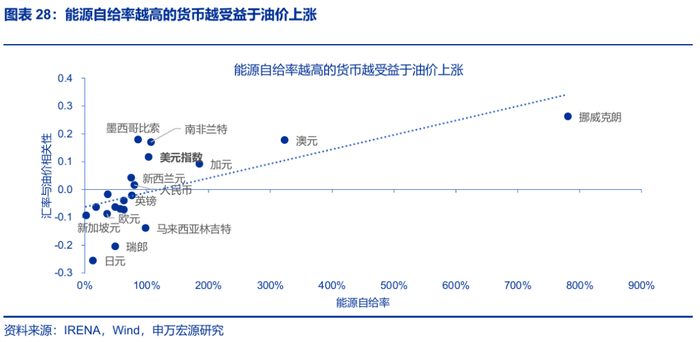 第二,美债利率趋于上行,美元、澳元等能源自给率较高国家的汇率或相对受益。1)如油价大幅上行,高企的通胀或导致美联储降息后置,美债利率或被进一步推高。2)美元具备“能源货币”特征,过去2年间,美元与油价正相关;如油价反弹,或为疲软的美元注入一针“强心剂”。