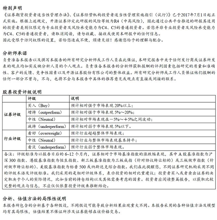 《证券期货投资者适当性管理办法》于2017年7月1日起正式实施。通过微信形式制作的本资料仅面向开源证券客户中的金融机构专业投资者,请勿对本资料进行任何形式的转发行为。若您并非开源证券客户中的金融机构专业投资者,为保证服务质量、控制投资风险,请勿订阅、接收或使用本订阅号中的信息。本资料难以设置访问权限,若给您造成不便,还请见谅!感谢您给予的理解和配合。若有任何疑问,请与我们联系。