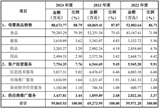 公司是一家数智化创新型母婴连锁企业,主营业务为母婴商品销售以及为上游品牌供应商、下游加盟商提供服务。公司采用“数智化+供应链+服务”三者有机结合的加盟连锁模式,依托数智化中台,为上游品牌供应商提供高效的市场推广服务,为下游加盟商提供其业务经营相关的各项服务,涵盖信息系统上线及运维、会员管理、精准营销、品牌推广、经营诊断与指导、标准化培训、商标授权及门店管理等。