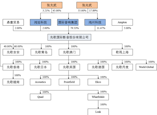 公司总股本为200,000,000股股份,其中国际音响集团持有公司159,056,000股股份,持股比例为79.53%,为公司控股股东。张太武先生、张光武先生分别持有国际音响集团45.00%、55.00%的股权,通过国际音响集团间接持有公司79.53%的股份;张光武先生为鸿州科技的执行事务合伙人,通过鸿州科技间接控制公司11.47%的股份;张太武先生为鸿延科技的执行事务合伙人,通过鸿延科技间接控制公司2.00%的股份。