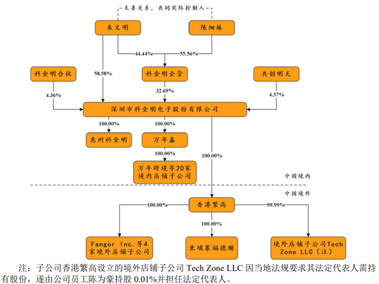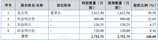 朱文明直接持有公司1,612.50 万股股份,直接持股比例为58.58%,为公司控股股东,并担任公司董事长。朱文明、陈细妹夫妇通过科金明企管间接持有公司32.69%股权,直接和间接合计持有公司91.27%的股权,为公司共同实际控制人。